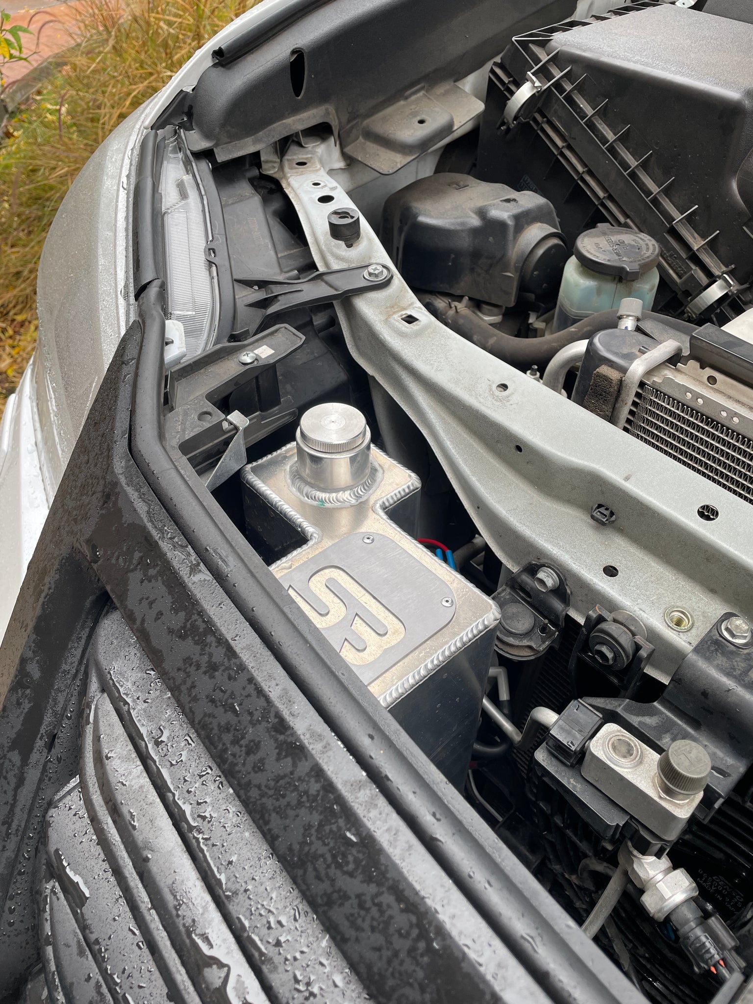 Every component of the Snowbound Customs Aluminum Washer Fluid Relocation Reservoir is 100% sourced in the USA using the highest quality materials. The reservoir features over 4 Liters of fluid capacity and is the only reservoir on the market that does not sacrifice capacity. It is also the only reservoir to integrate the factory washer fluid level sensor and headlight washers depending on trim level. Each one is meticulously crafted with hours of work going into laser cutting/bending aluminum sheet, CNC machining our billet aluminum caps and finally, TIG welding the pieces together with one of the best TIG welders in the nation (seriously, take a close look at the welds on these!)